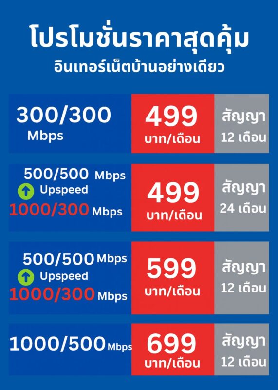 ติดเน็ตบ้านทรู เร็วแรงอันดับ 1 กับแพ็กเกจความเร็ว 500/500 Mbps ราคาเริ่มต้นเพียง 499 บาท ติดตั้งฟรีโดยทีมงานมืออาชีพจาก True Online ไม่มีค่าใช้จ่ายเพิ่ม